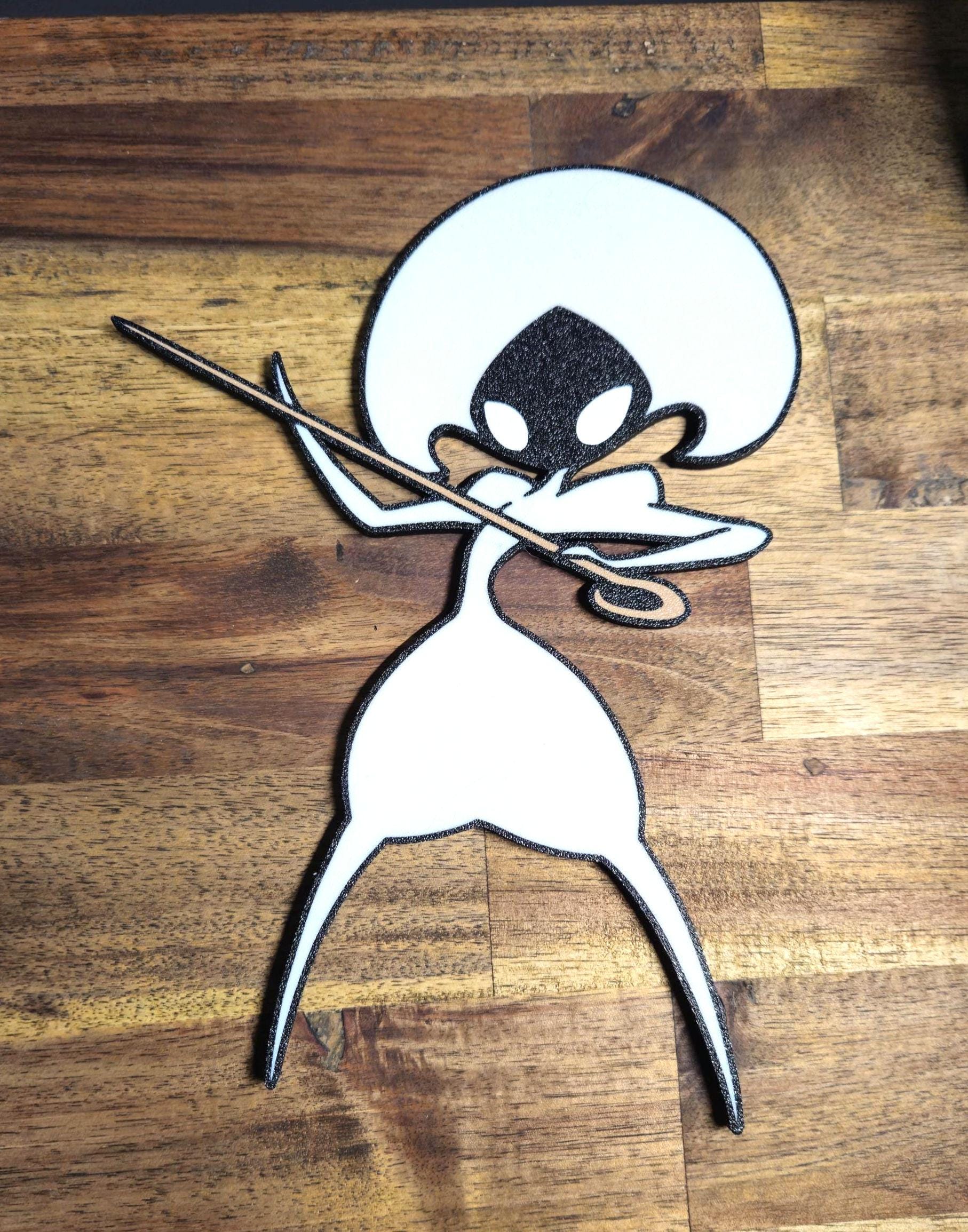 Get this cute shelf ornament of Lace from the video game Hollow Knight Silksong. She is around 21.5cm tall and 5mm thick.